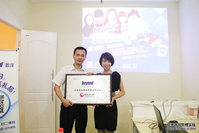 7月17日,beyond公司授予爱齿尔口腔“beyond冷光牙齿美白优质合作单位”的牌匾,爱齿尔口腔的徐主任与beyond公司代表在众人见证下完成了授牌仪式。